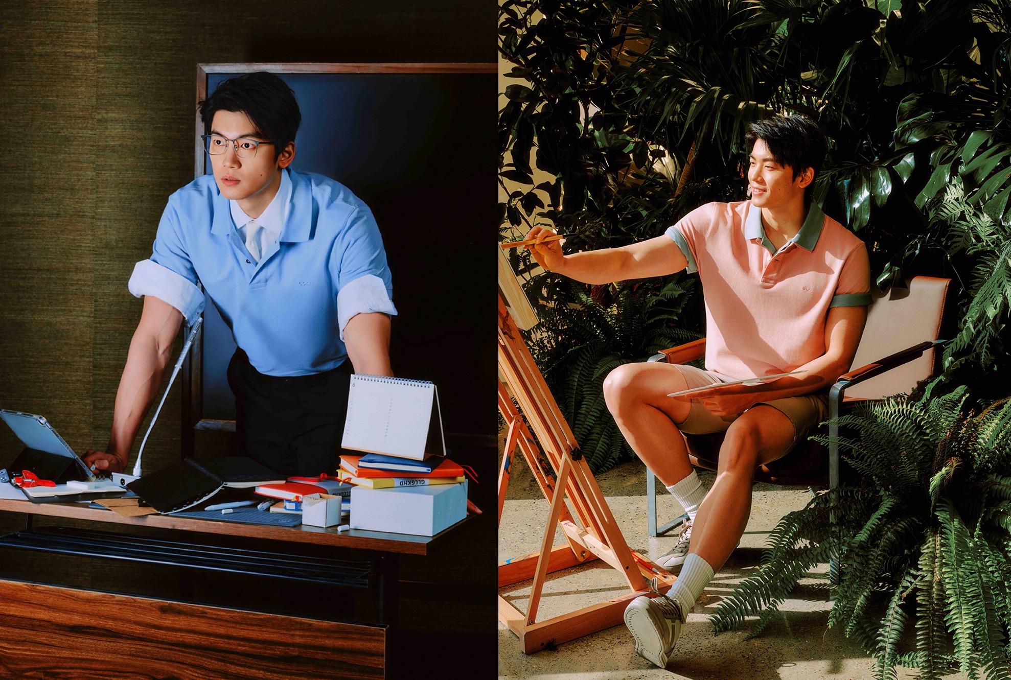 汪顺在大片中超越赛场光环,展现其鲜为人知的多维人生。他身着全新BOSS PALLAS Polo 衫——“PALLAS”之名源自胜利女神,象征坚定与荣光。该款在经典版型基础上全面升级:采用柔软亲肤的纯棉珠地布,腰线略微放松以彰显现代松弛;胸口以同色系纱线精绣小型 Logo,尽显低调质感。同一款式,两种姿态:或端坐于书卷环绕的静谧空间,神情专注如思辨时刻;或置身绿意氤氲的玻璃穹顶之下,执笔勾勒心中图景。一静一动,皆由同一款上衣自然承载,印证其从正式到休闲的无缝切换能力。