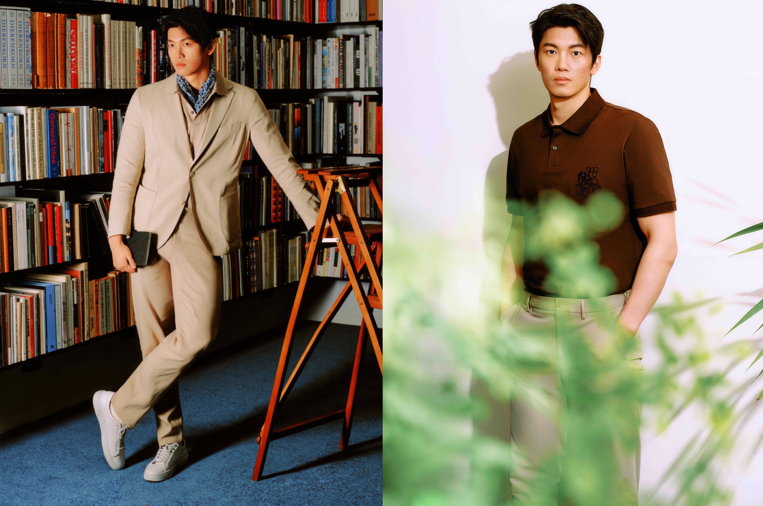 在静谧的图书馆场景中,他身着 BOSS臻品系列卡其色 Polo,采用无Logo极简设计,以顶级 SUPIMA® 匹马棉织就,经丝光处理后,触感柔滑如羊绒,垂坠挺括。搭配2026春夏同色系BOSS Performance机能通勤系列“科技亚麻”西装,共同构筑全天候商务造型的优雅新解。而在旷野林间,另一款设计以经典Double B标识为蓝本,左胸特别饰以中国市场限定的三角梅镂空刺绣,灵感源于岭南风物,既致敬本土美学,亦彰显独特时尚态度。